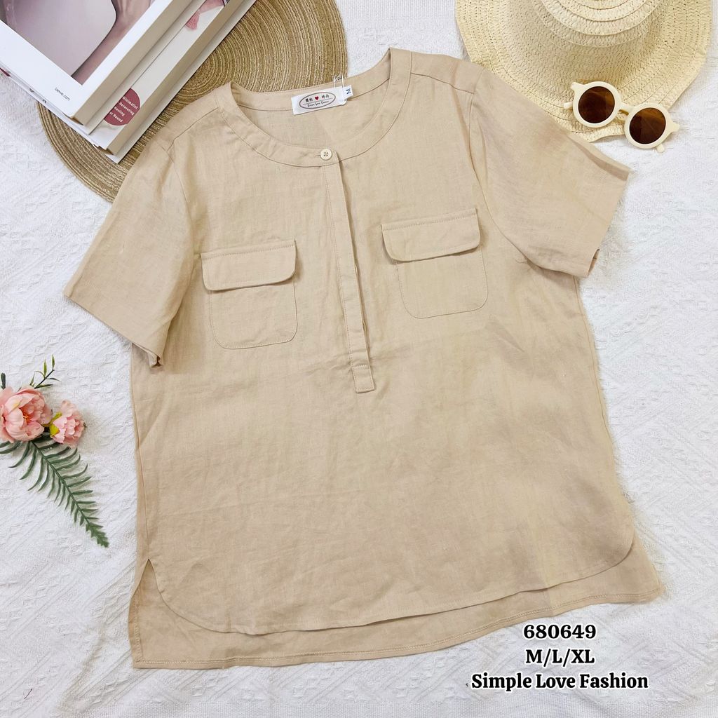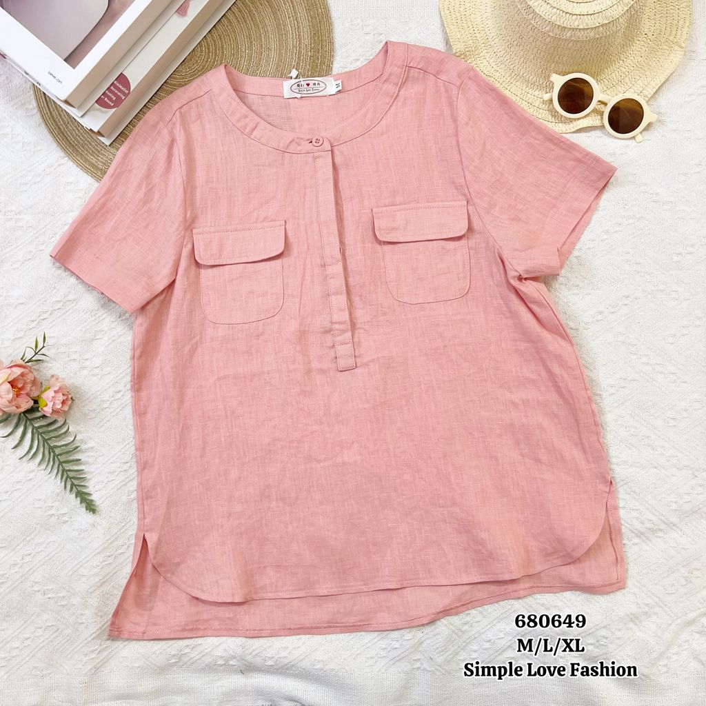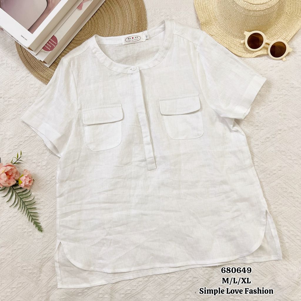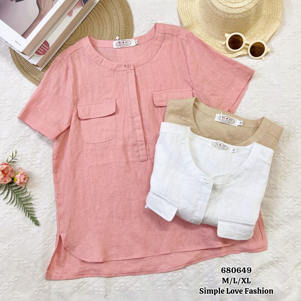 Elegant Women Cotton Blouse Round Neck Half Button 680649